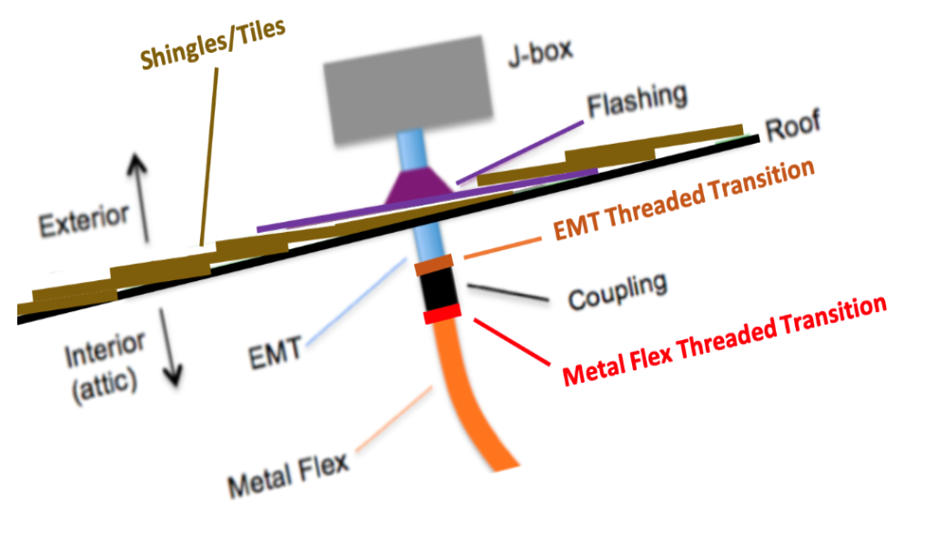 As soon as the conduit exits the attic and approaches the exterior of the home, it must transition from metal flex conduit to EMT (Electrical Metallic Tubing).